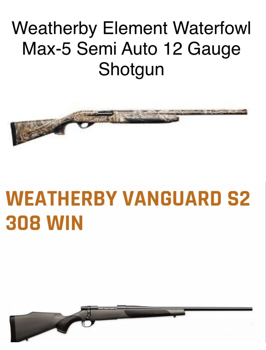 3. WEATHERBY 2 ITEM COMBO: WEATHERBY ELEMENT WATERFOWL MAX-5 12 GUAGE SHOTGUN / WEATHERBY VANGAURD S2 308 WIN